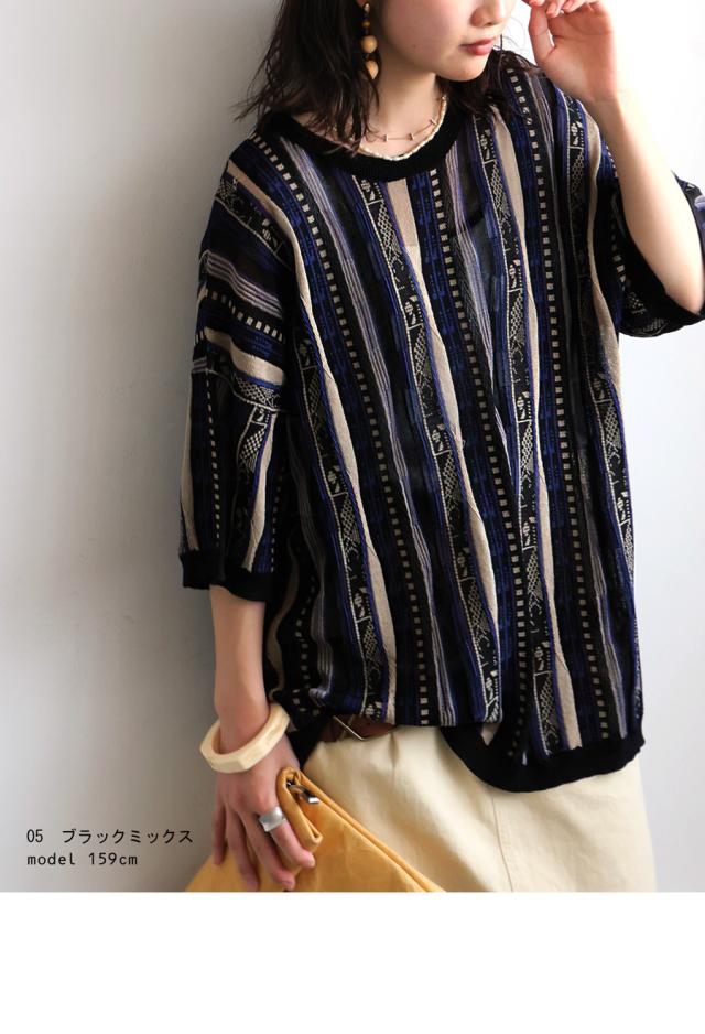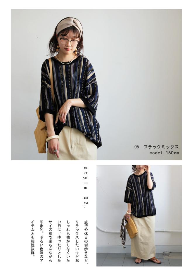 夏でも快適に着られる通気性のよさが特徴です。編地に独自の立体感があることで、透けすぎないバランスもポイント。