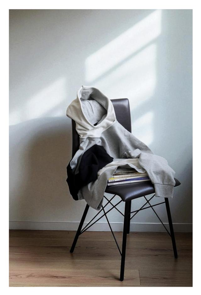 立体感のあるネックラインのフードが顔まわりに自然なアクセントを加え、ゆるっとしたシルエットでこなれた印象に仕上がります。