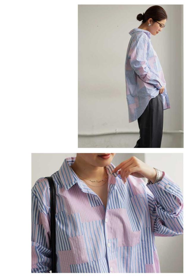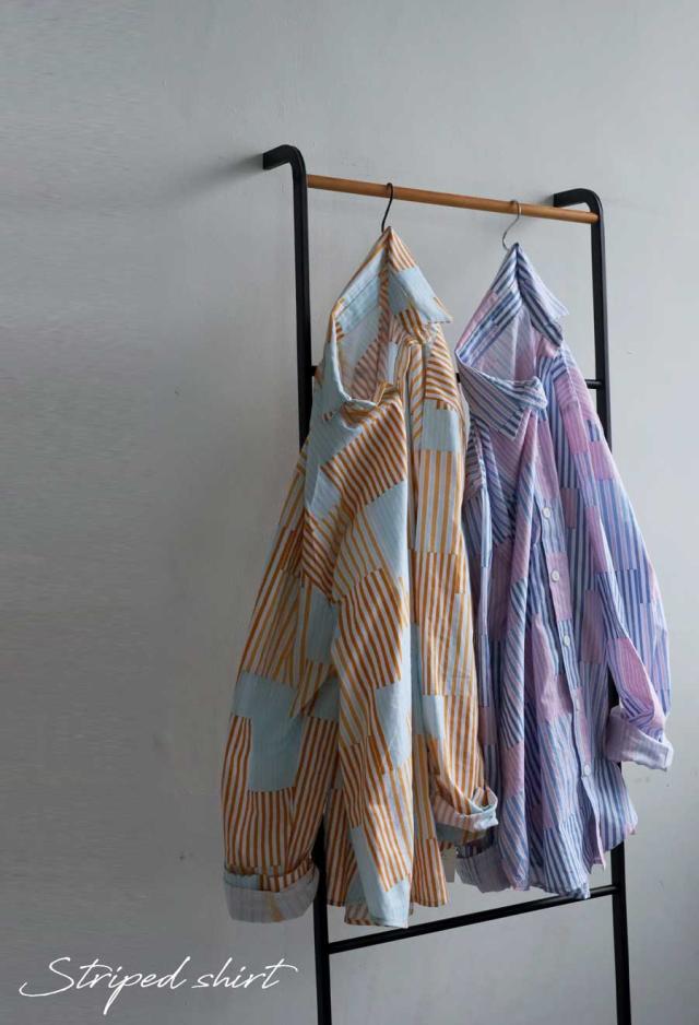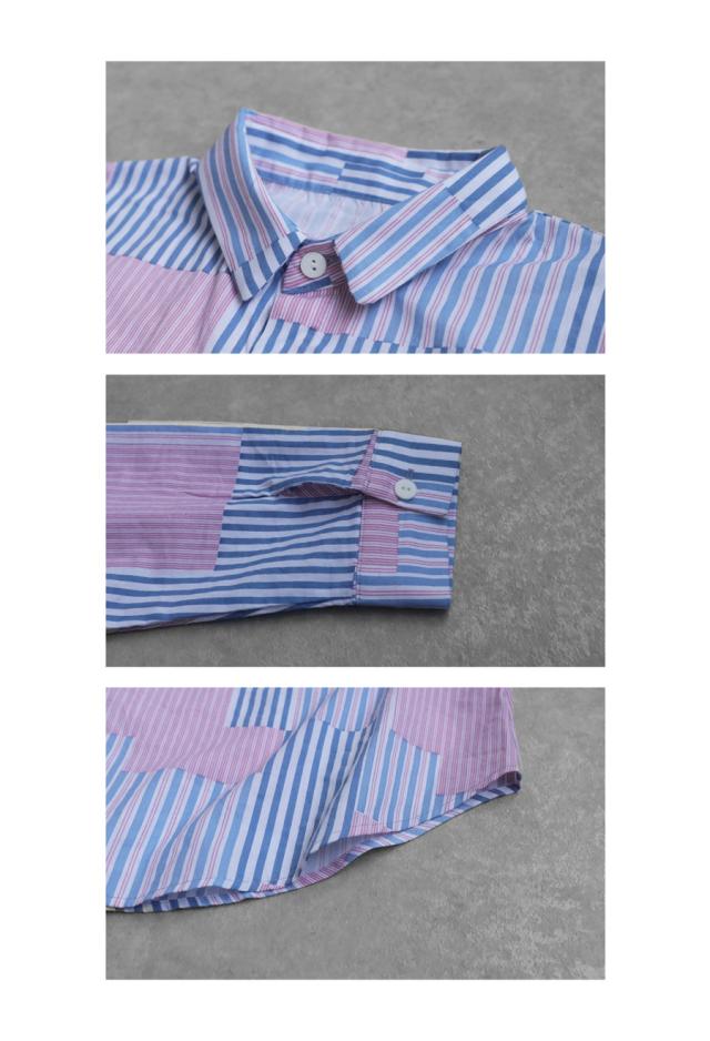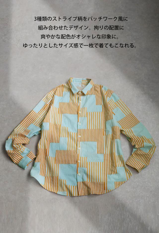3種のストライプをパッチワーク風に組み合わせたデザインが印象的なシャツ。