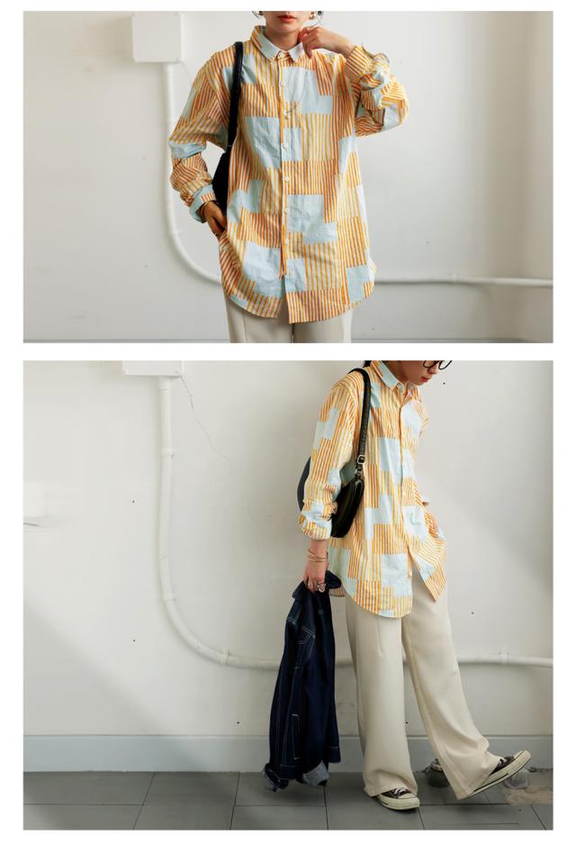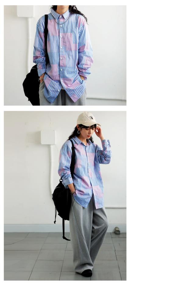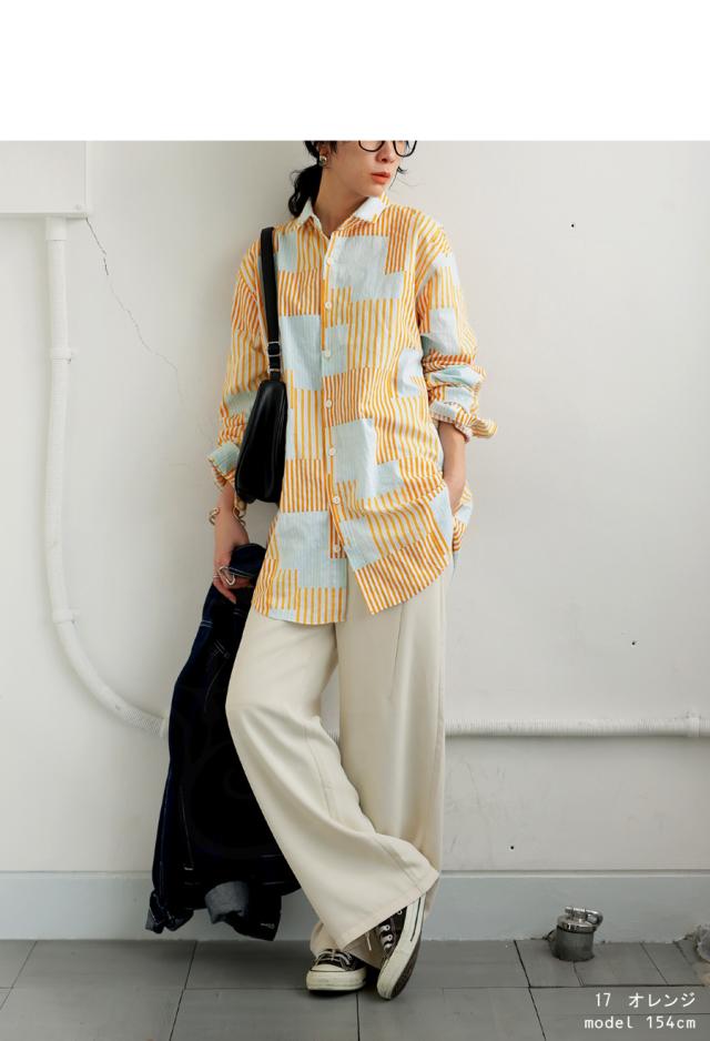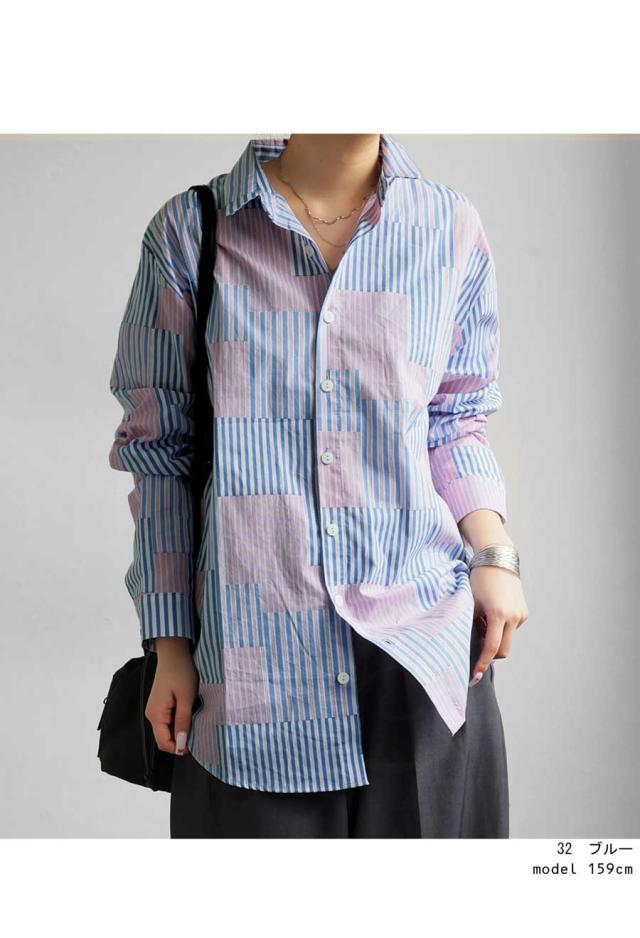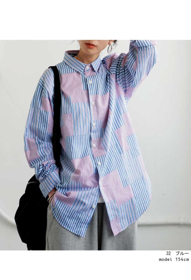 ze-01118 ストライプシャツ 柄シャツ シャツ レディース トップス 長袖 切替 羽織り ストライプ柄 綿 配色 パターン ゆったり カジュアル シワになりにくい 大きめ レイヤード