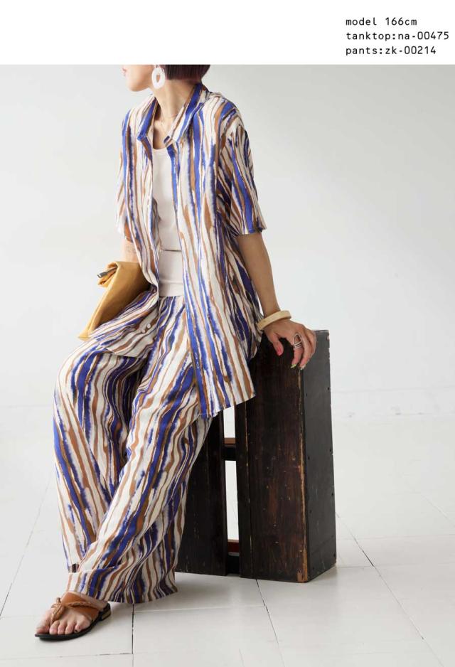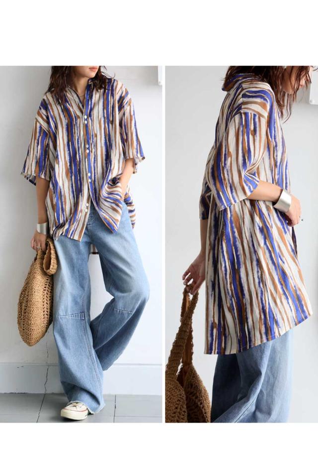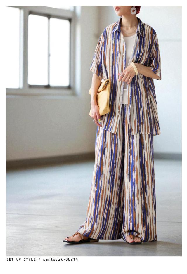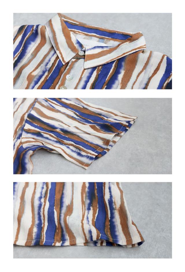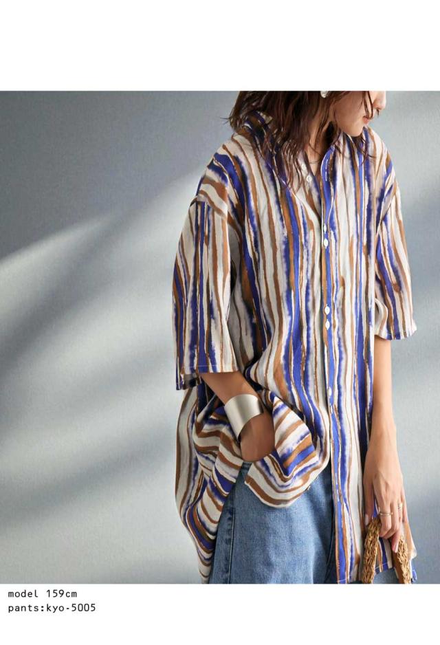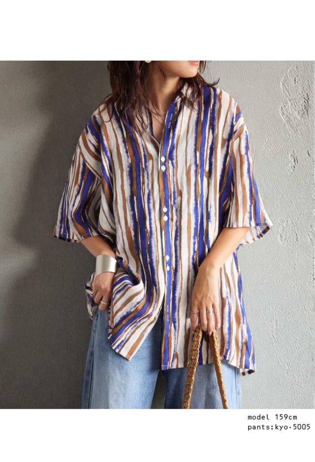 zk-00212 トップス 半袖シャツ 水彩柄 ストライプ オーバーサイズ 涼感シャツ シェルボタン ニュアンス柄 夏 春 着やせ効果 ゆったり セットアップ レギュラーカラー