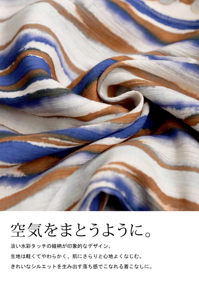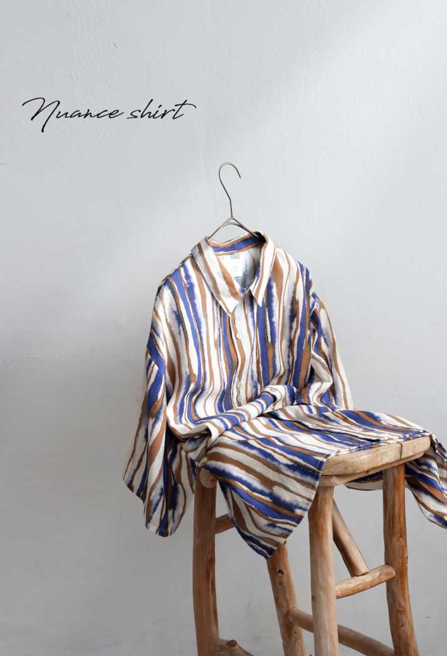 水彩で描いたようなにじみ感のある縦ラインが目を惹く、ニュアンスたっぷりのストライプ柄シャツ。