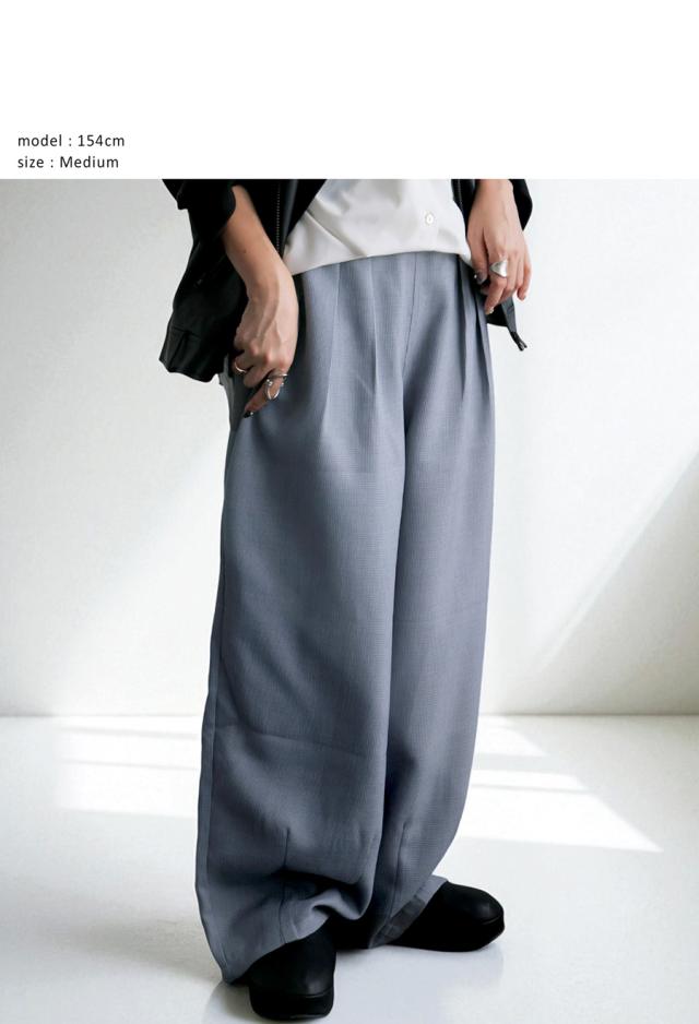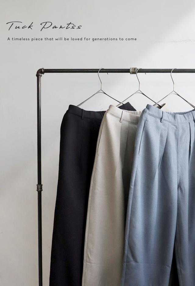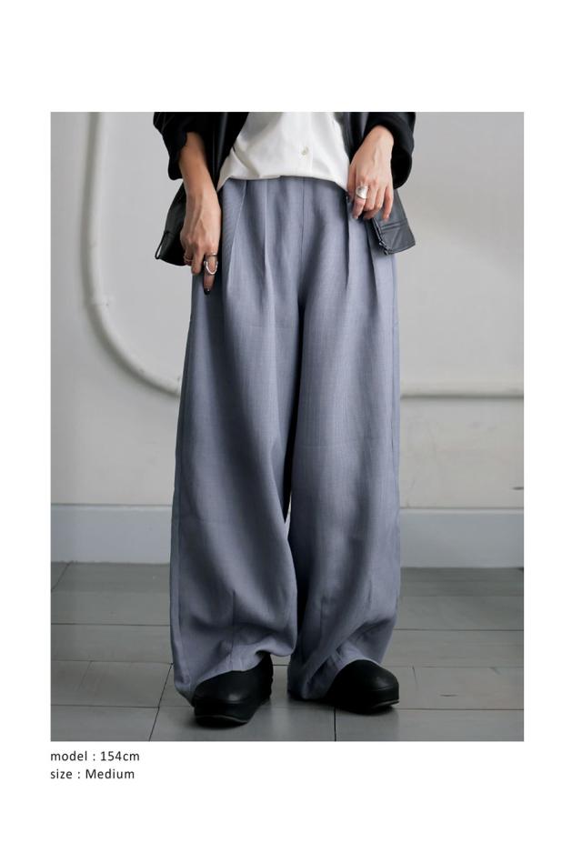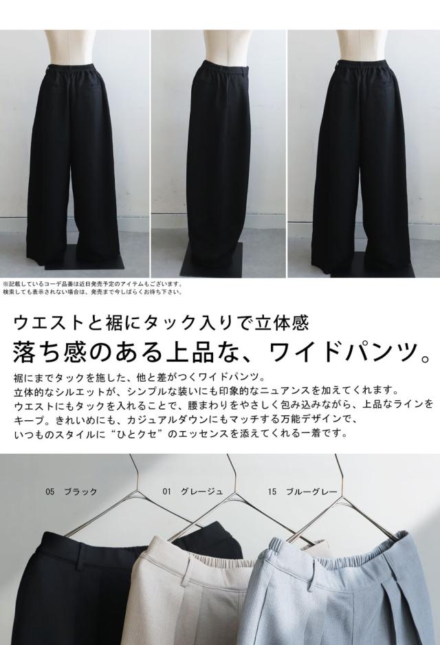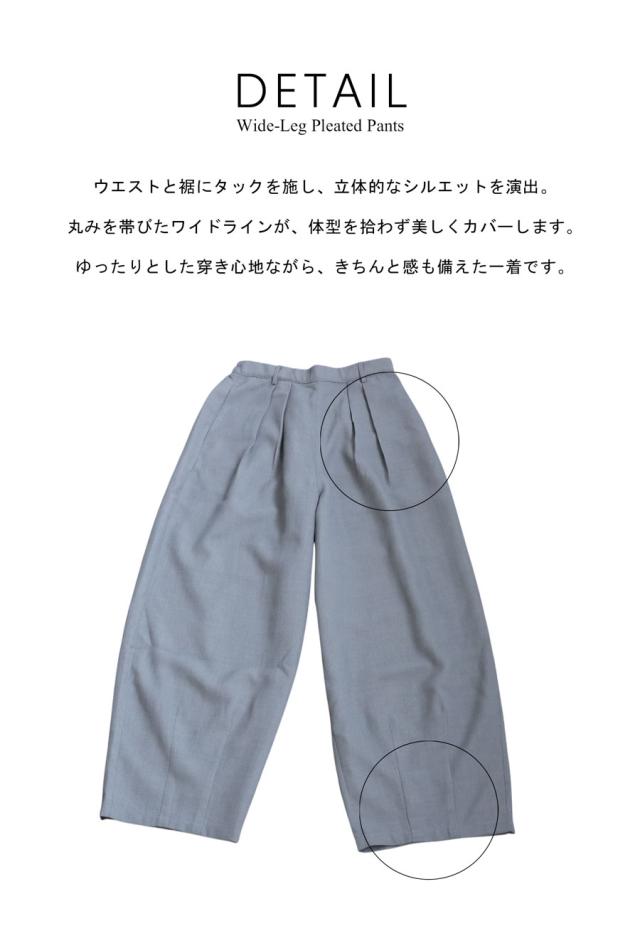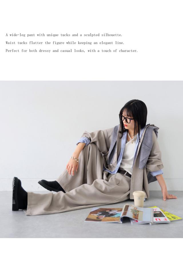 ウエストと裾にタックを施した立体感のあるワイドパンツは、きれいめにもカジュアルにも着こなせる万能デザイン。