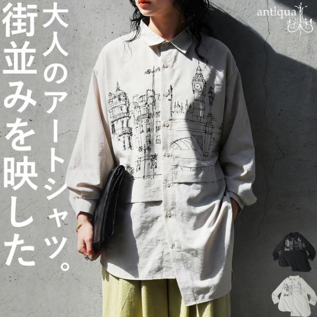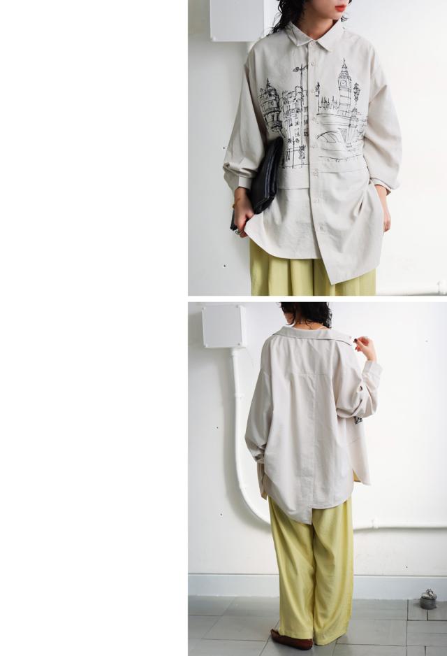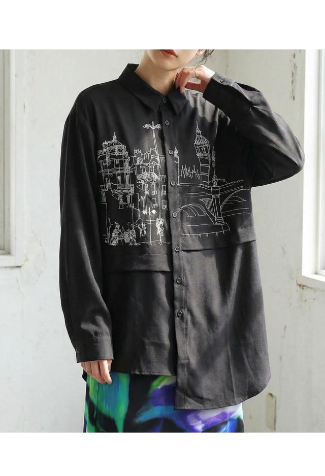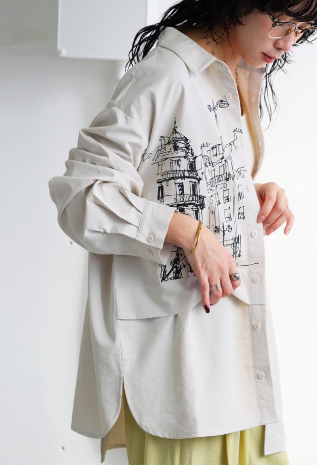 一枚のアート作品のように街並みを描いたプリントが印象的なデザインシャツ。