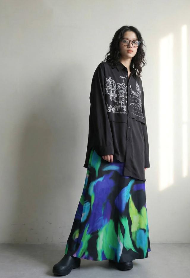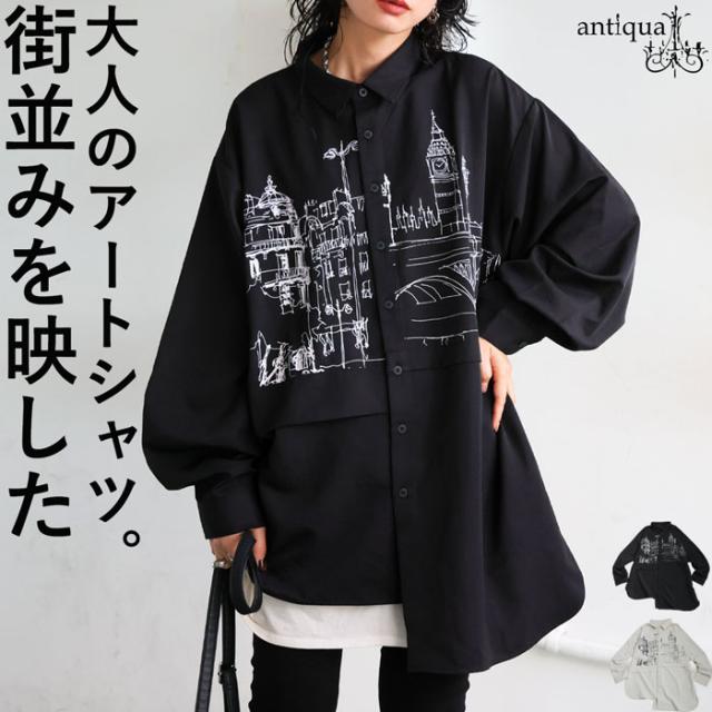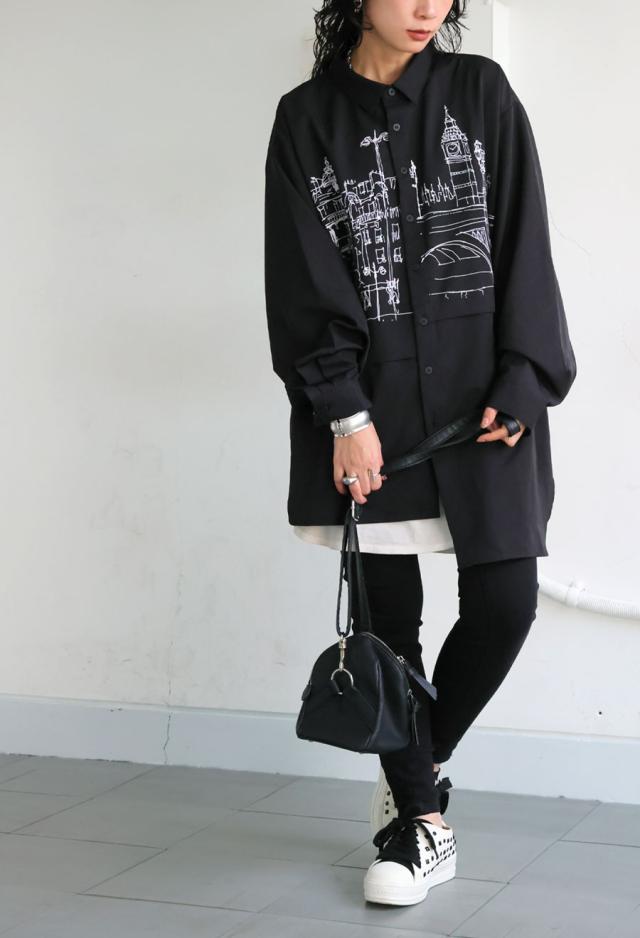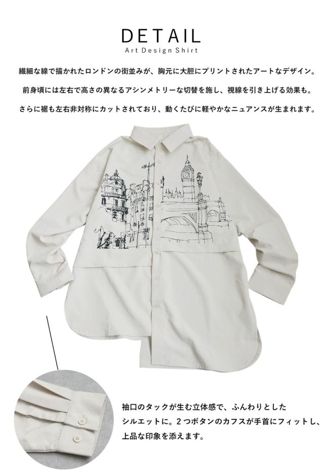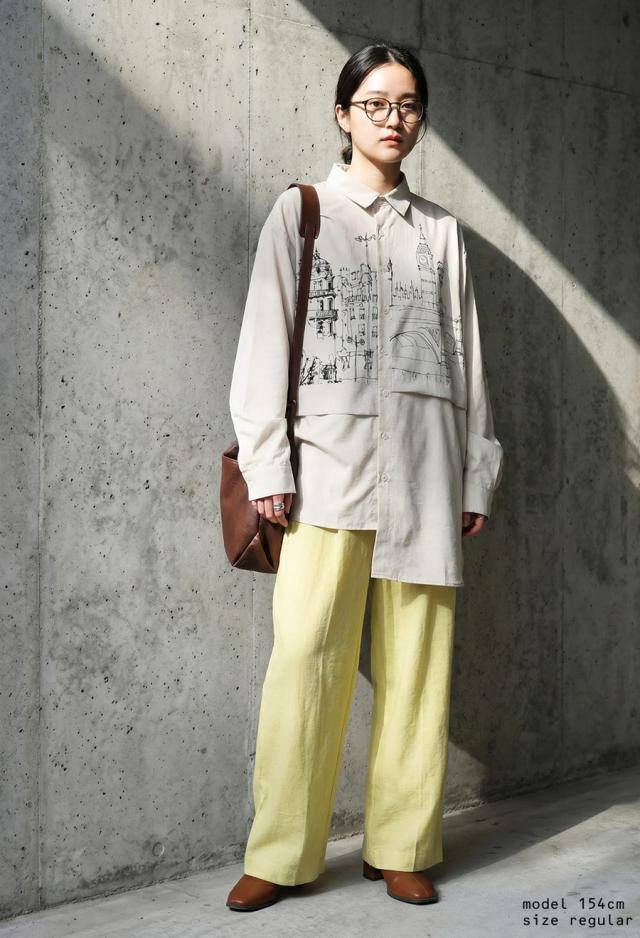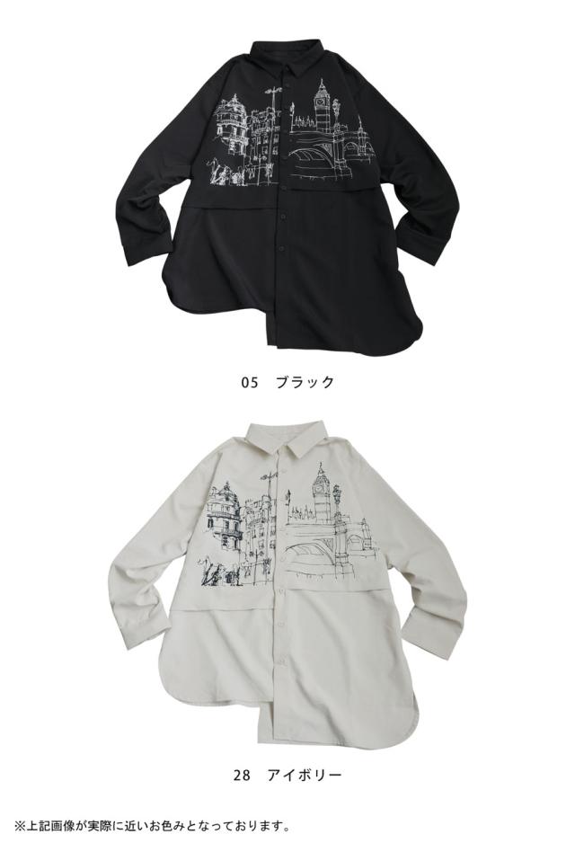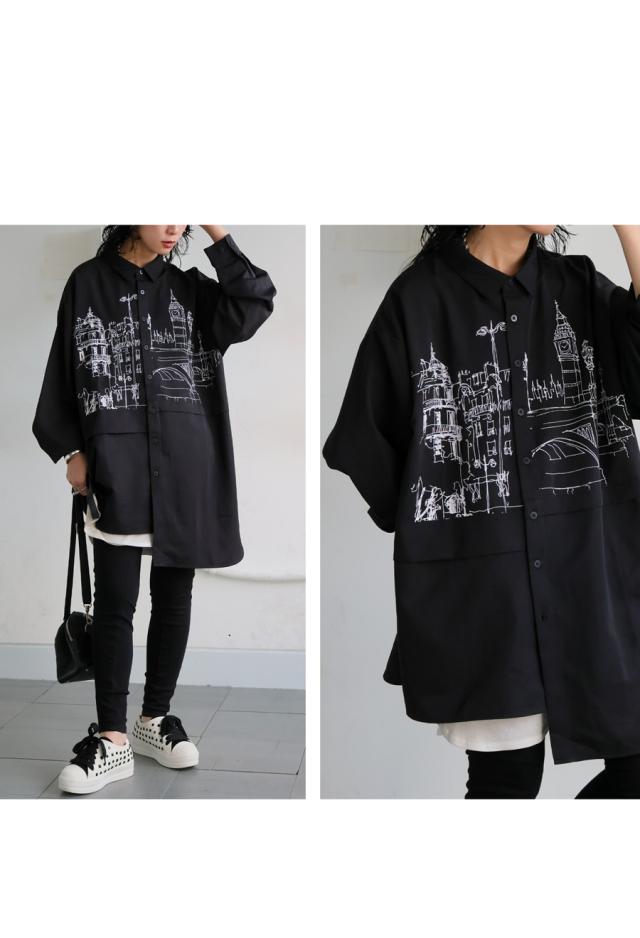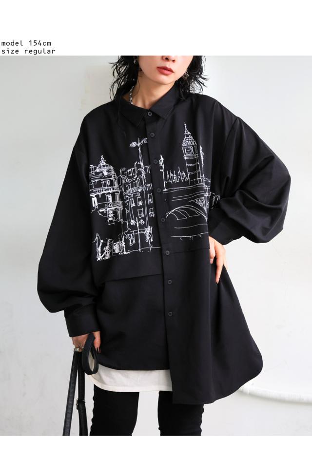 zk-00236 トップス アシメ ゆったり モード 街並み プリント 柄シャツ デザインシャツ 前開き ボタン カジュアル 体型カバー ゆったり アレンジ レイヤード 重ね着 ユニセックス