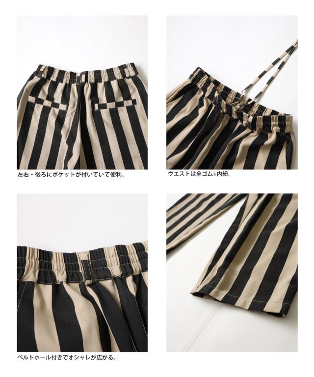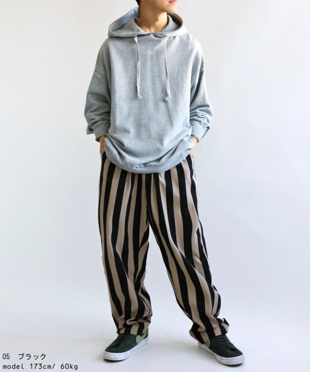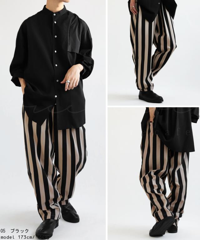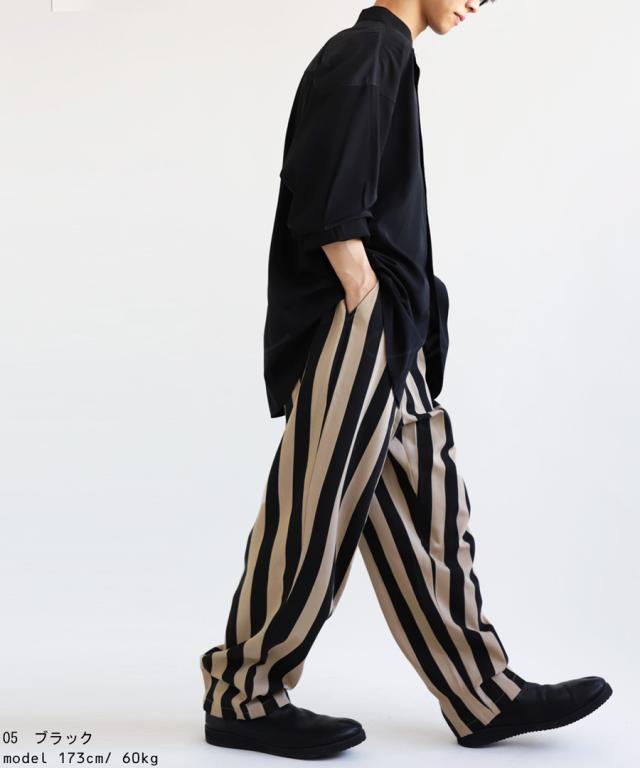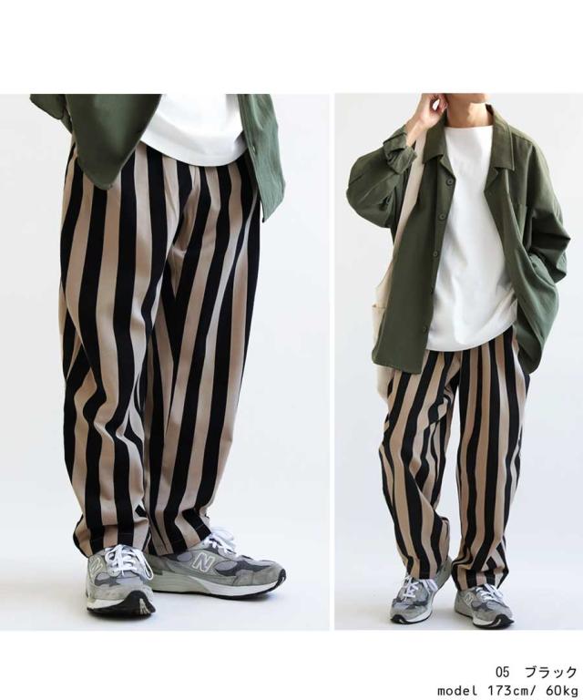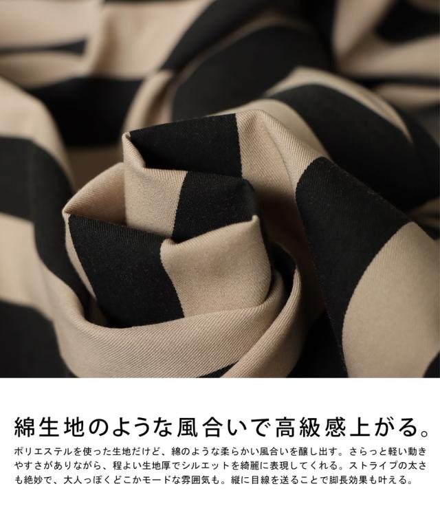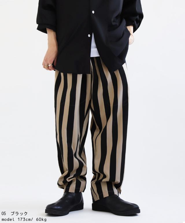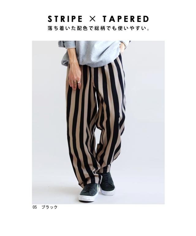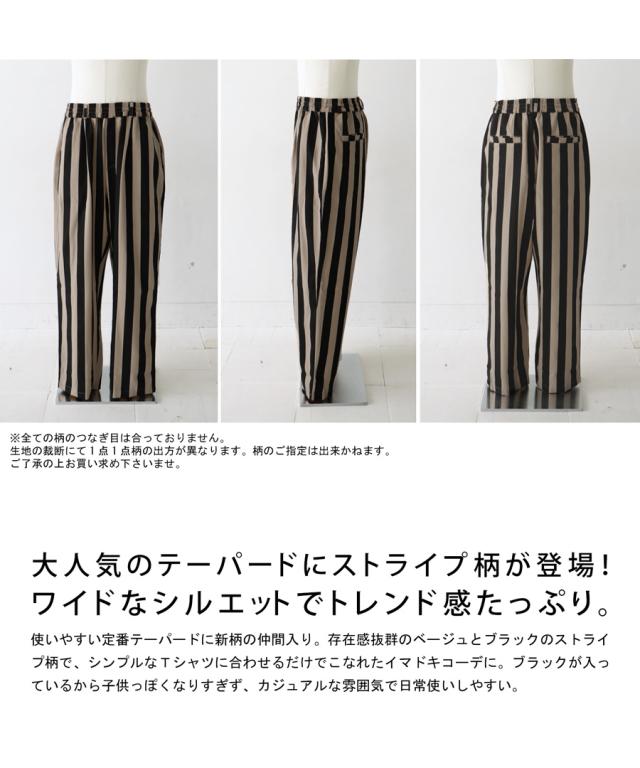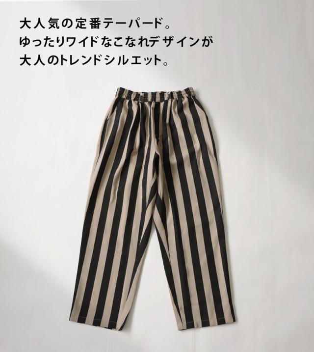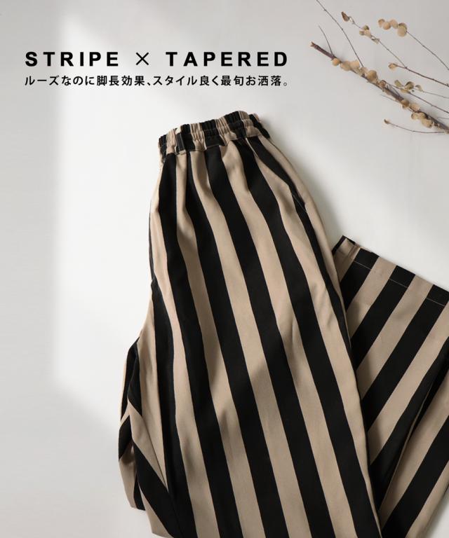 zy-00081z ストライプ柄 柄 柄パンツ シンプル テーパード 長ズボン ワイド ゆったり ウエストゴム 高級感 美脚 上品 細見え 脚長効果 レーヨン混 ポケット付き