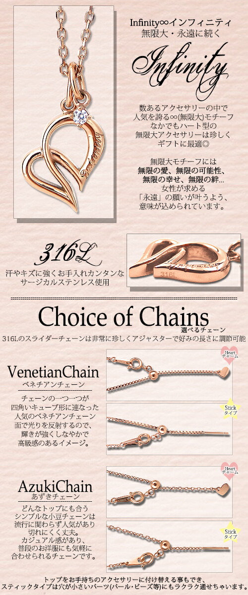 | コメント | スライダー式のステンレスチェーンはご自身でサイズ調整ができとても便利です。 あずきチェーンとベネチアンから選択可能 チェーンのエンドパーツはスティックとハートの選択ができます。 サージカルステンレス使用のアクセサリー。 医療用に使われているサージカルステンレスは肌に優しく、金属アレルギーでアクセサリーをつけられない方にも安心です。 シルバーアクセサリーより軽くて丈夫で変色しにくい素材ですのでお手入れ不要で海水や温泉につけても大丈夫です。 |
