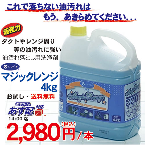 あす配対応 / 送料無料 / 超強力油汚れ用洗剤 マジックレンジ 4kg 業務用 e-style業務用 クリーナー アルカリ性 油汚れ 厨房洗剤 業務用洗剤 大容量 詰め替え 市販品の約10倍の洗浄力