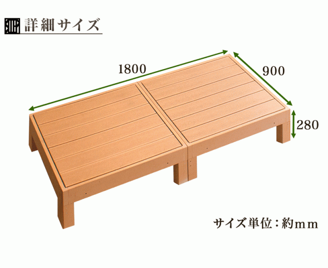 補足説明:180cm 縁台 ウッド風に仕上げた色合いは、人気で高級感のある銘木チークに似せました。ベンチ代わりの休憩のスペースや、ペット同伴可のカフェテラス、簡易ステージなど、業務用としても展開できます。腐食の進行がとても遅く強度も長持ちします 木材のようには腐らない、金属でないから錆びない(組立接続部分には金属ネジを使用しています)、特殊加工で製造した樹脂デッキ シロアリなどの心配も無用、雨に濡れても錆びない、そして1台に大人が10人乗っても大丈夫な強度で長く使えます。重たいところがGOOD強風対策もバッチリ。耐光性も高いので、庭先の縁台に、おしゃれなお庭作りに最適です。お庭に合わせて自由に配置できますので、思い通りのレイアウトが可能。シリーズの柵パネル(ガード・手すり)やステップ台(踏み台)でより安全におしゃれなデッキに。玄関口や窓周り、洗濯物干しスペースなどに段差がある場合は特におすすめのです。のんびりオシャレに、人を呼びたくなる新たな生活スペースをあなたも作ってみませんか。リラックスできるお庭作りにエントランス ガーデン 飲食店にもお勧め カフェテラスで優雅なひと時を過ごす ロータイプ 高齢者や小さなお子さん 小型犬にも ペット 愛犬のペットも嬉しい縁台 エクステリア 室外 アウトドアやDIYが好きな方に ウッドデッキ、縁台、ぬれ縁、人工木材 ロータイプウッドデッキ、人工デッキ、樹脂 ベランダ、えんがわ、ベンチ、庭先、段差 人工木のウッドデッキ、腐りにくい、人工木は錆びない 錆びにくい、色褪せにくい、しっかり、テラス アイウッド、ガーデニング、バーベキュー、人工木、DIY 縁台 人工木、ステップ、踏み台、玄関台、スリッパ ひなたぼっこ、休憩、太陽、物干し竿、エントランス、頑丈 ウッドパネル、リフォーム、バルコニー、エクステリア 本体1台は90cm幅0.25坪、デッキセット、常温常湿、メンテナンスが楽、水洗いOK、組み立て簡単、ウッドテラス シンプル ナチュラル