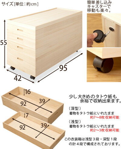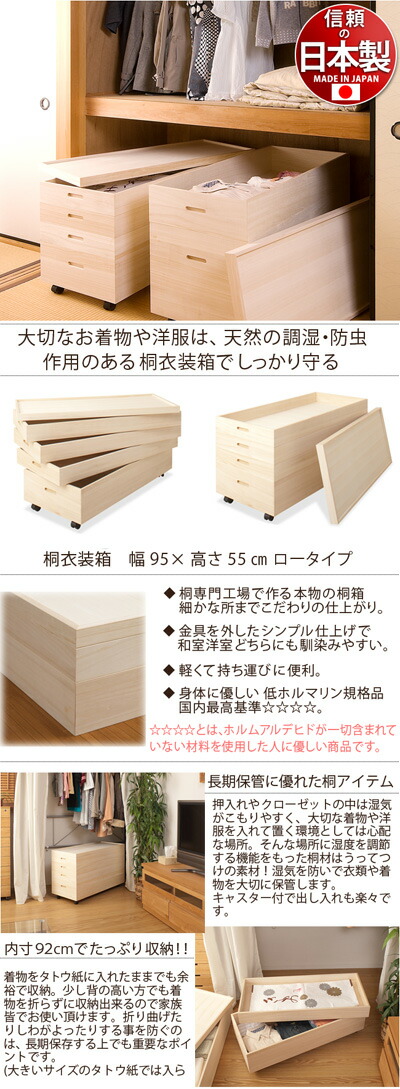 桐衣装箱 幅95高さ55 ロータイプ (キャスター付き)日本製 完成品 4段 衣類の収納に最適な桐材使用 和風衣類収納 きもの収納 収納ボックス箪笥タンスたんす 国産品 木製/薄型/通販/送料無料 【送料込み】 新生活 組立不要