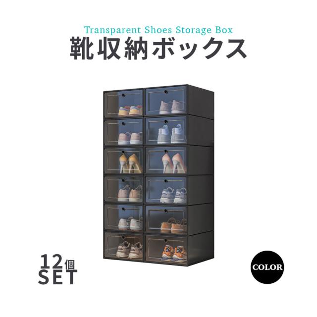 シューズボックス 12個入り 靴収納ボックス 折りたたみ式 ディスプレイケース クリア 何個でも積み重ね可能 (ブラック)