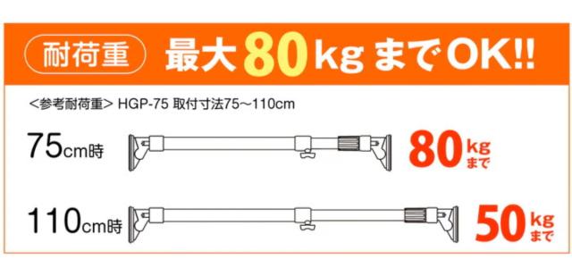 75cm使用時で80kg、110cm使用時で50kgまでの重さに対応しています。ジャッキ式でしっかり圧着固定するので、75cm使用時でスーツを約40着掛けられます。