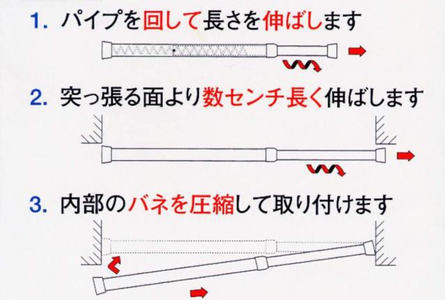 | 材質 | パイプ:鉄・塩ビ被覆仕上げ 樹脂部品:ポリプロピレン樹脂・合成ゴム バネ:鉄・防錆油処理 |