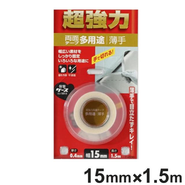 両面テープ 多用途 薄手 超強力 0.4mm×15mm×1.5m ( 強力 両面 テープ 超強力テープ 強力テープ 屋内 屋外 外 ベニヤ板 ベニヤ 合板 ガラス日本製 )