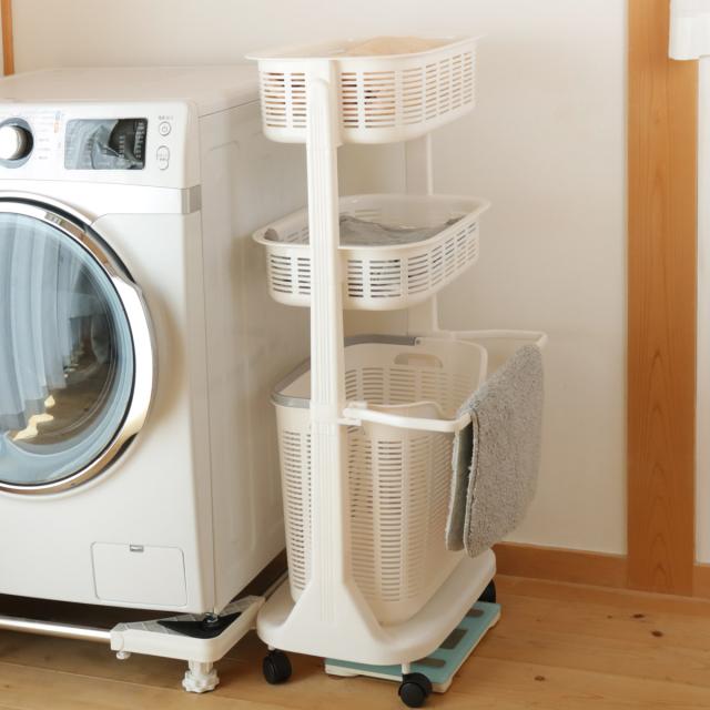 下段のバスケットには脱いだ服、上段・中段のバスケットにはタオルやパジャマなど分けて使用することで、衣類が散らかりません。狭い脱衣所でも場所をとらずにご使用頂けます。