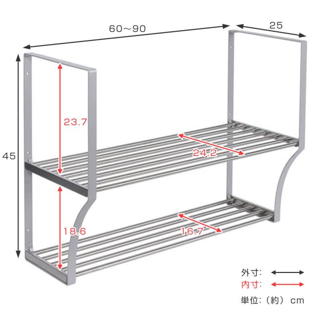 | サイズ | 約 幅60〜90×奥行25×高さ45(cm) 上棚:約 幅60〜90×奥行24.2(cm) 下棚:約 幅60〜90×奥行16.7(cm) |