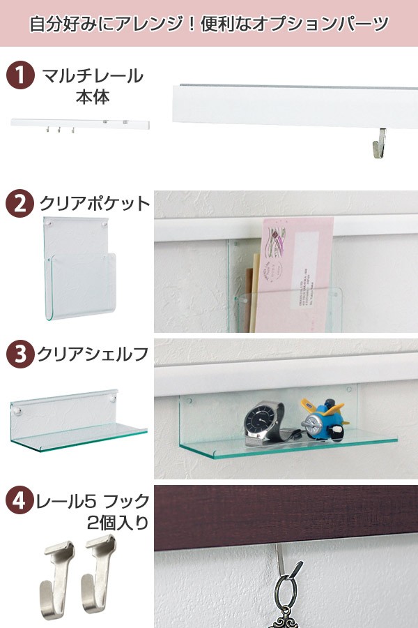 ![]() 専用パーツを好きな位置に取り付け可能 マルチレール幅60.6cm | ![]() 専用パーツを好きな位置に取り付け可能 マルチレール幅90.9cm | ![]() 鍵や小さなバッグなどを掛けるのに便利 フック2個入り |