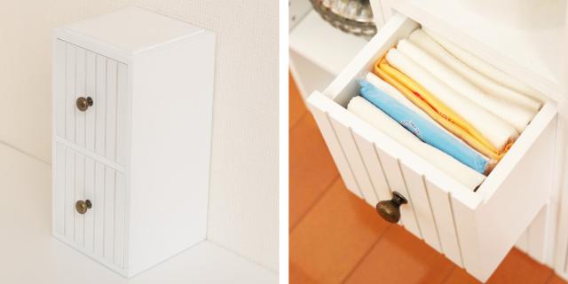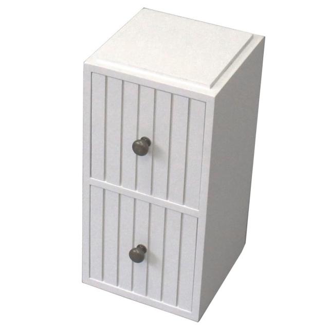 羽目板風デザインに金属取っ手がおしゃれなシンプルデザインなので、どんなトイレ空間にも馴染みます。引出し2段タイプなのでトイレットペーパーのストックや見られたくない物の収納におすすめです。