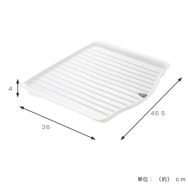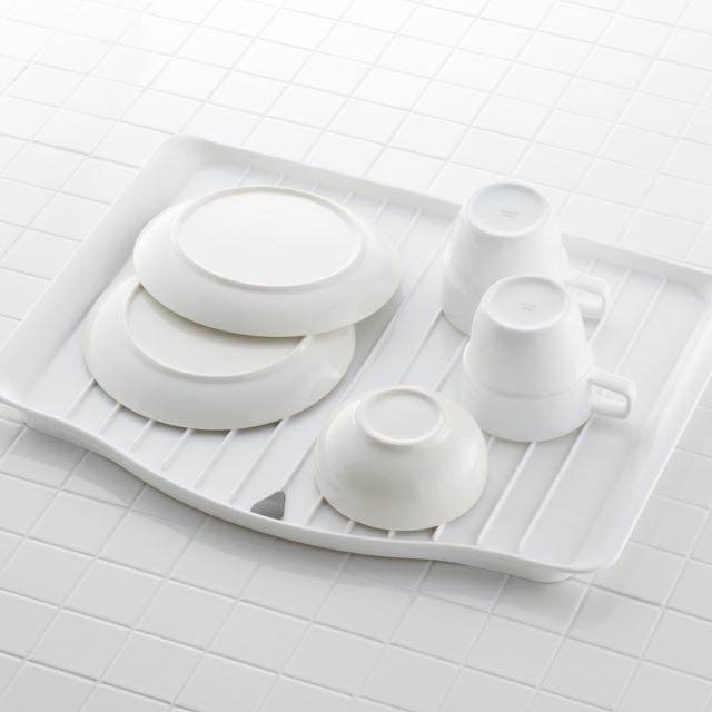 シンク横などに置いて洗い物をサッと置ける水切りトレーです。食洗機やメイン水切りに入りきらなかった時などの水切りにピッタリです。コンパクトながらもたくさん置ける大きめサイズ。プレート形状なので、使用しない時はシンク下などの隙間に収納することができます。