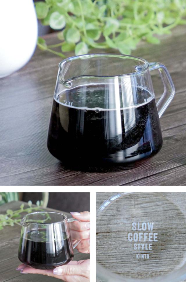 耐熱ガラス製のサーバーです。ガラスならではの透明感と、直線でデザインされた都会的なシルエットが、全体にバランスの良い抜け感を演出します。約2杯分(300ml:1杯150mlとして)の抽出量の目安となる小さなドットがデザインされており、容量が一目でわかります。また電子レンジ対応なので、冷めてしまっても、温め直していつでも美味しくいただけます。