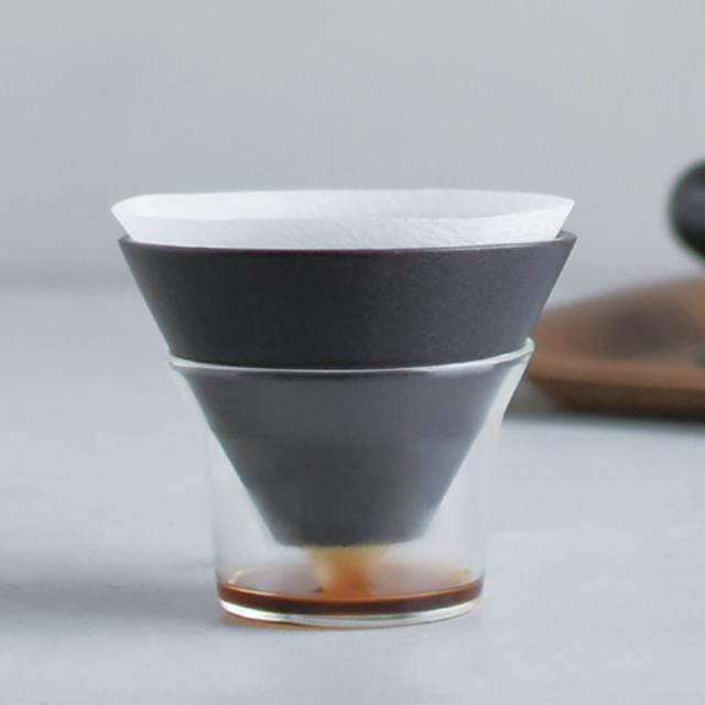 珈琲を淹れ終えたら、セットのガラス製ホルダーへ移動しておけます。滴るお湯で周囲を汚す心配がなく、片付けは後にしてゆっくりとコーヒーを味わえます。