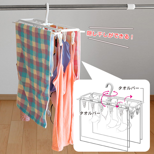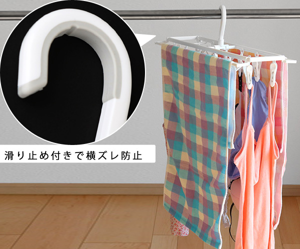 ![]() ![]() ![]() 隠し干しできるから、下着を干すのに最適♪ 小物干しの両サイドのタオルバーを広げれば、タオルで隠し干しが出来ます。タオルと同時に靴下や下着などの小物が干せるので便利です。 ![]() ノンスリップ(滑り止め)のハンガー部分で横ズレ防止 フック部分は90度ごとに回転固定するから安定感バツグン!また、風などでの移動を防ぐノンスリップ(滑り止め)が施されています。パイプハンガーにかけるのにちょうど良いフックですので、室内干しにもオススメです。 ![]() ![]()