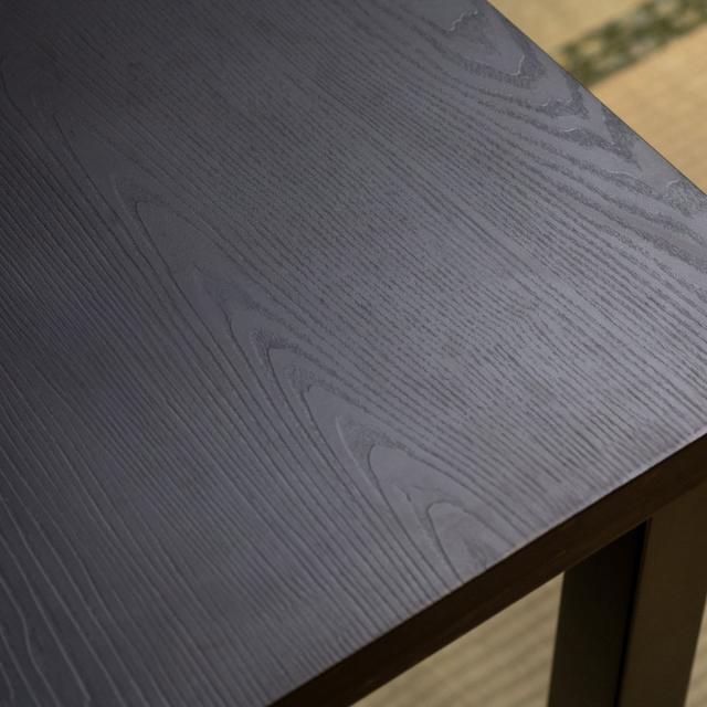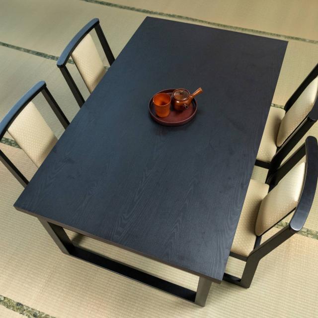 木目の風合いと落ち着いた色合いが和の雰囲気によく合うダイニングテーブルです。高さは約60cmと一般的なテーブルより低めで、和室などの「床」での生活空間に設置しても違和感なくお使いいただけます。