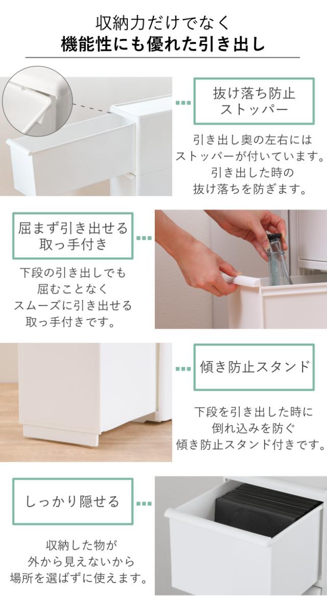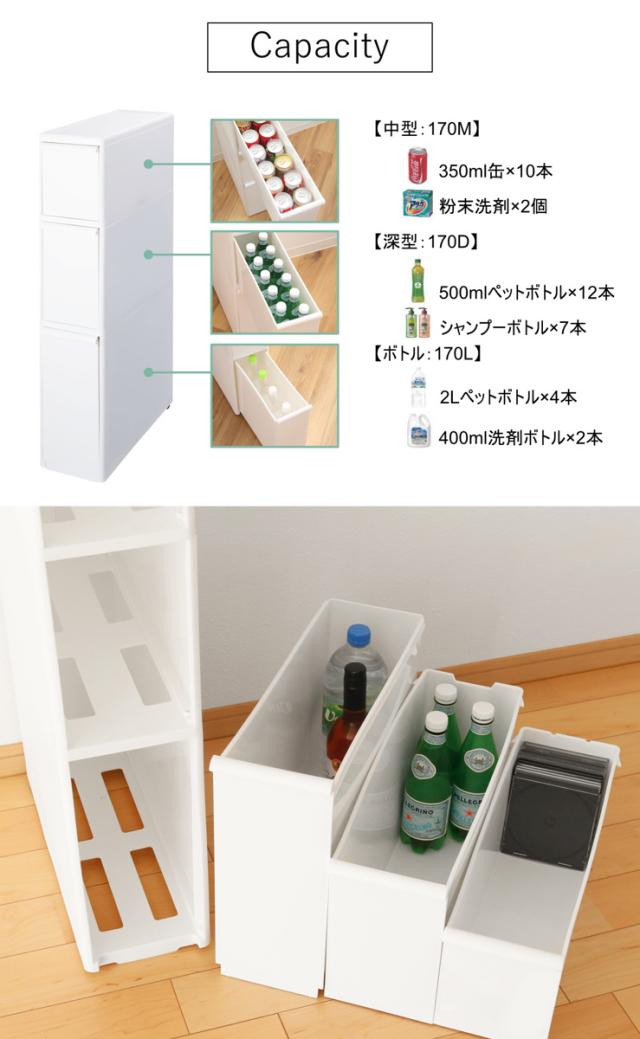 | 引き出し1段あたり耐荷重 | 中型・深型:約 5kg ボトル:約 10kg |