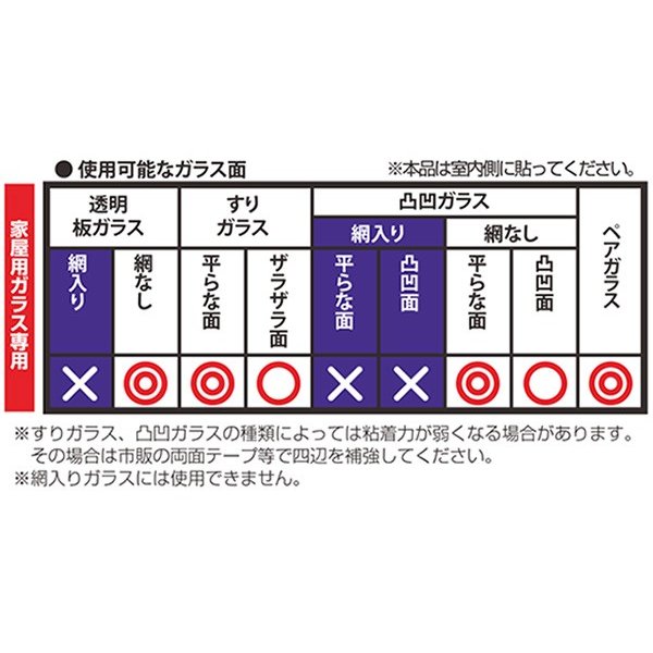 | 注意事項 | 使用できるガラス 透明板ガラス、すりガラス、凹凸ガラス、ペアガラス 使用できないガラス 網入りガラス ※すりガラス、凹凸ガラスの種類によっては粘着力が弱くなる場合があります。その場合は市販の両面テープ等で四辺を補強してください。 |