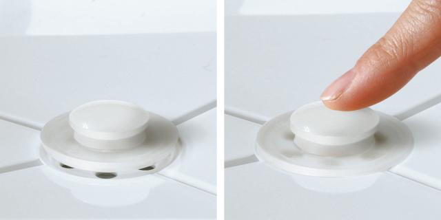 止水栓を上に引き上げると、排水口から水が流れ、下に押し下げると、水が流れません。排水、止水を自由に切り替えられるので、設置場所を選びません。