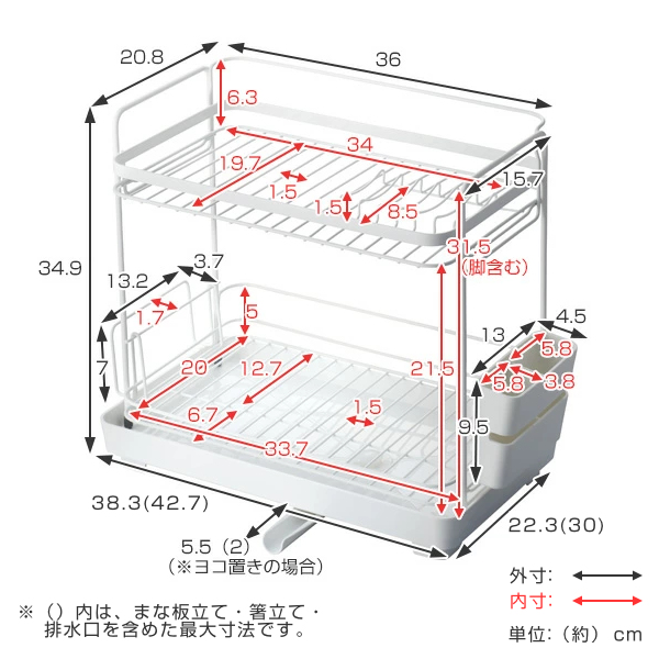| サイズ | 約 幅30×奥行42.7×高さ34.9(cm) ※まな板立て、箸立て、排水口含む最大寸法 |