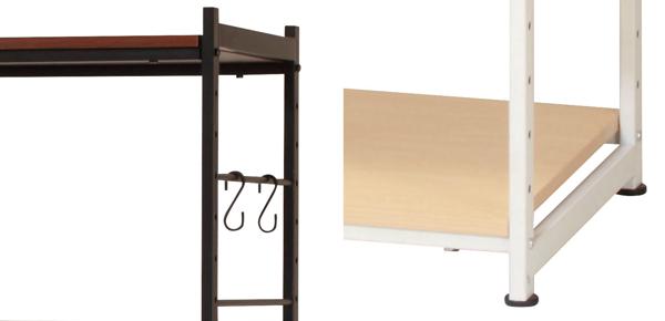 | 便利なS字フック付き 付属のS字フックを使用すれば、バッグやミトンなどを掛けることができます。 | ガタつき防止のアジャスター付き 設置時のガタつきを防止するアジャスター付きです。 |