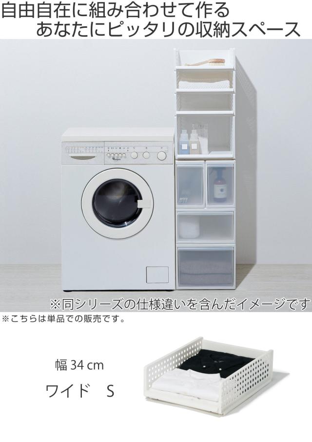 幅が同じ引き出しや、バスケットともスタッキングができるので、省スペースで大容量の収納が可能です。