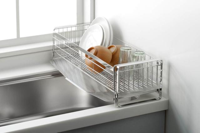スッとスライドすると、幅が約2倍になる伸縮式の水切りラックです。食器の量やスペースに合わせて収納スペースを広げることができます。来客時には伸ばして広々、シンクを広く使いたいときは縮めてコンパクトに、必要に応じて大きさを変える事ができるので、スペースを有効に使うことができます。