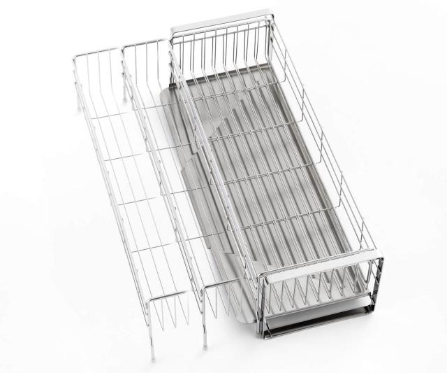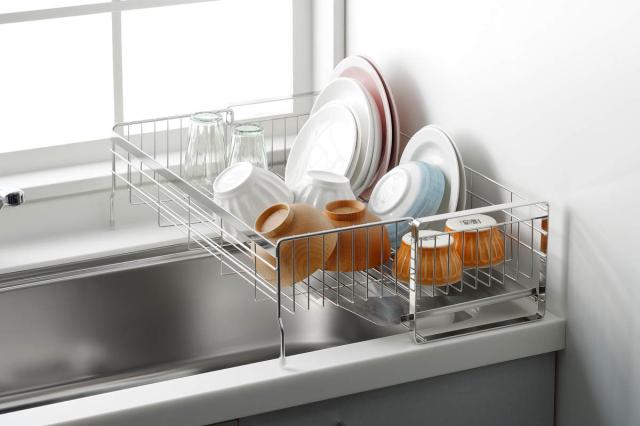 ●洗い物や設置するスペースに合わせて容量を自由に調整できる伸縮式の水切りラックです。