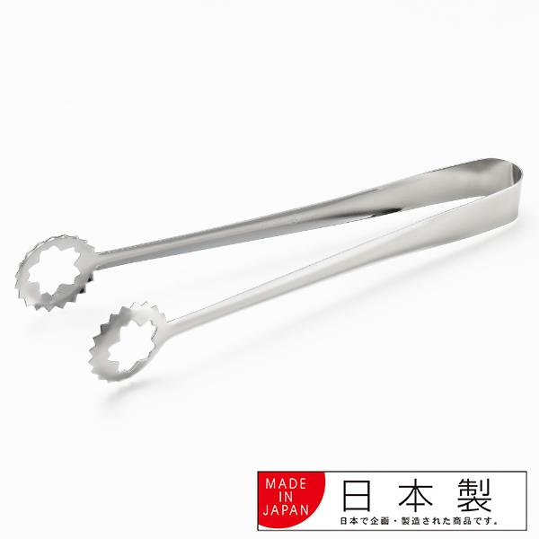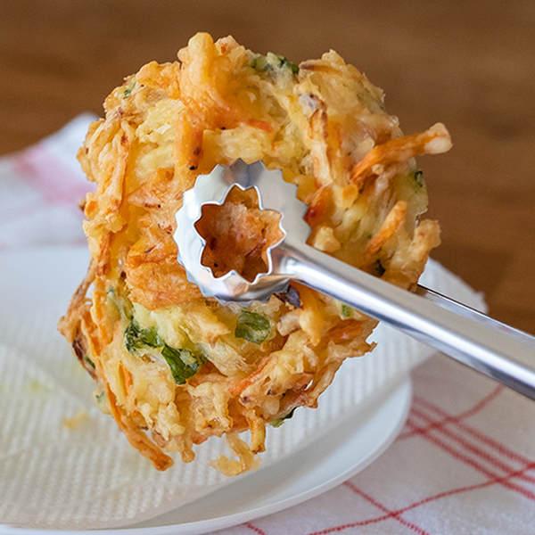 天ぷらなどをしっかりと挟んで取り出す揚げ物トングです。真ん中の花状の穴で油がしっかりと切れます。