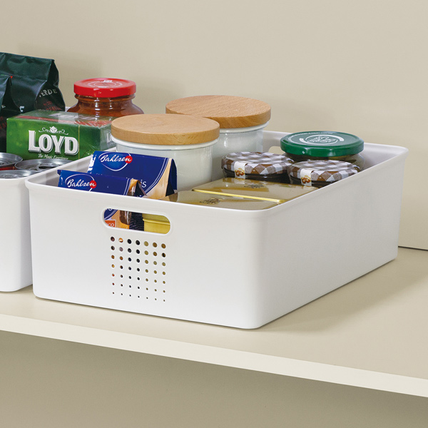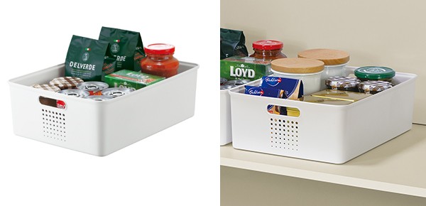 | 棚を傷つけない柔らかい素材 出し入れする際、収納棚を傷つけない為に柔らかいポリエチレンを使用しています。 | 物を見つけやすい浅型 中に入れた物がパッと見て分かりやすい浅型サイズは、保存容器や製菓道具まで幅広い物の収納に便利です。 |