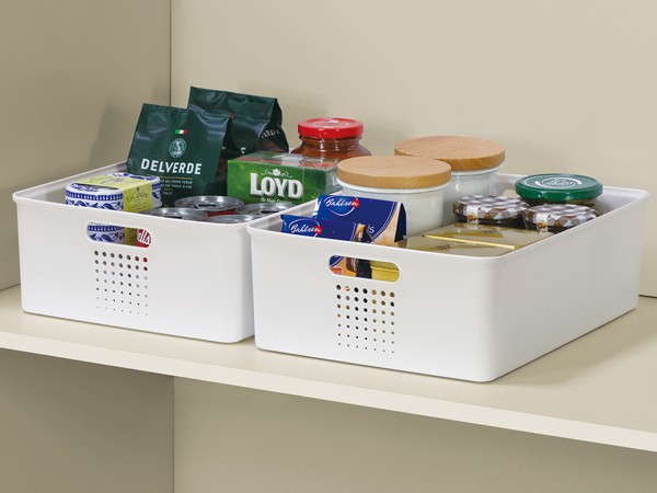 「シューノ・L(ハーフ)」はパントリー中段や下段での収納に最適です。ジャムの瓶や缶詰など比較的背の低い物の収納に向いています。また、両サイドに持ち手が付いているので引き出しやすくなっています。