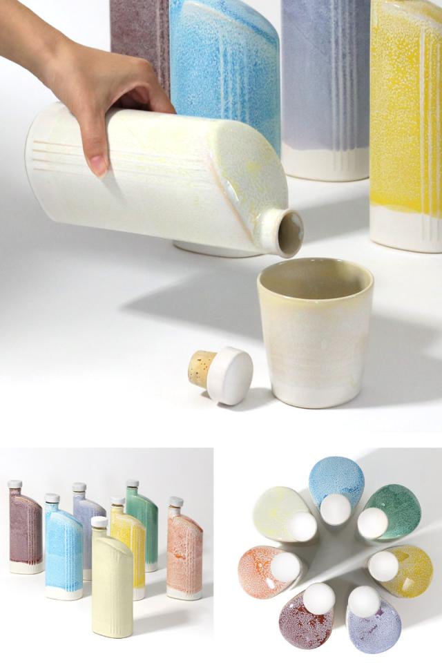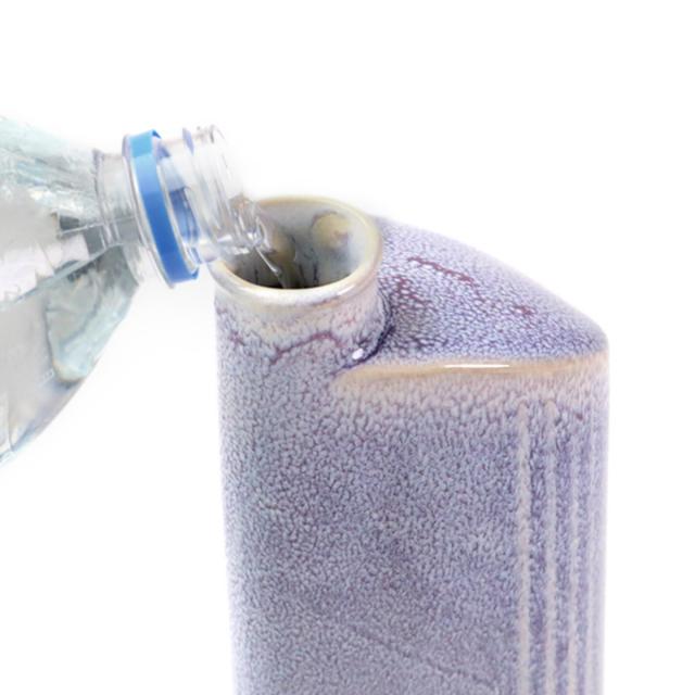 女性が片手でも持ちやすい大きさで、下部がしずく形になっており、倒れても転がりにくい形状です。ひとつひとつ異なる釉薬の流れは手作業ならではの味わいです。底部は素地本来の肌触りを感じていただけます。