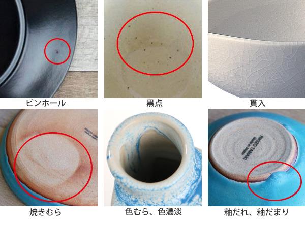 原料や製造方法により、上記のような特性がみられる場合があります。ひとつひとつのうつわの持つ個性、温かみある風合いとしてお楽しみいただければ幸いです。