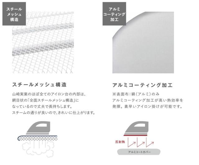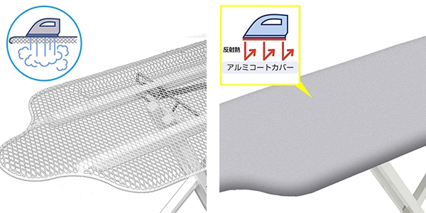 | スチールメッシュ構造 本体は大変丈夫なスチール製で熱による歪みなどが生じにくいです。また、全面メッシュ構造なのでスチームの通りがよく、パリッときれいに仕上がります。 | アルミコーティング加工 表面のアルミコーティング加工が高い熱効率を発揮して、素早いアイロン仕上げが可能です。 |