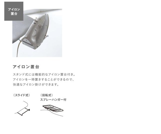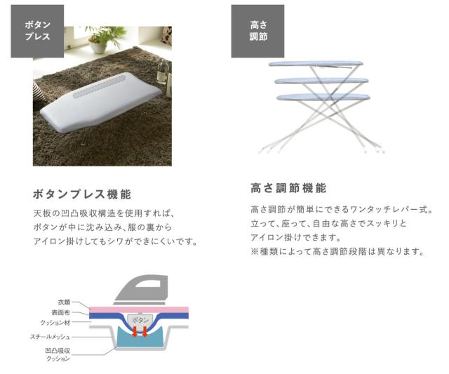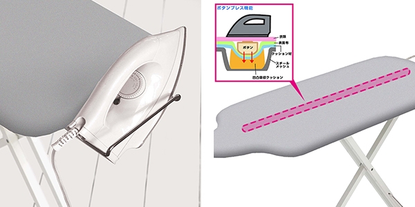 | スライド式アイロン置き台 出し入れしやすいスライド式のアイロン置き台は、使わない時はしまっておけるのでとても便利です。 | ボタンプレス機能 アイロン台の一部が凹凸吸収構造になっているので、ボタンが沈み込み、アイロン掛けをきれいに仕上げることが可能です。 |