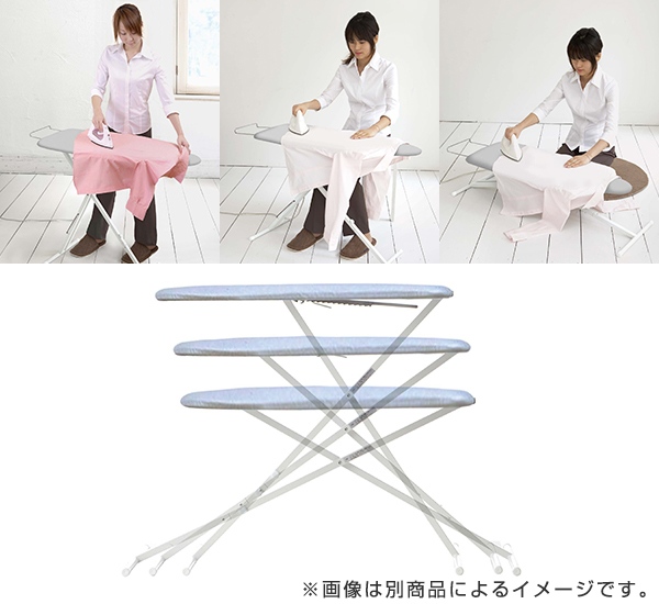 | 材質 | 表面布:綿100%(アルミコーティング) クッション材:ポリエステル 天板・脚部:スチール(粉体塗装) ボタンプレスゾーン:ポリウレタンフォーム アイロン置き台:スチール(クロームメッキ) キャップ:ポリエチレン |