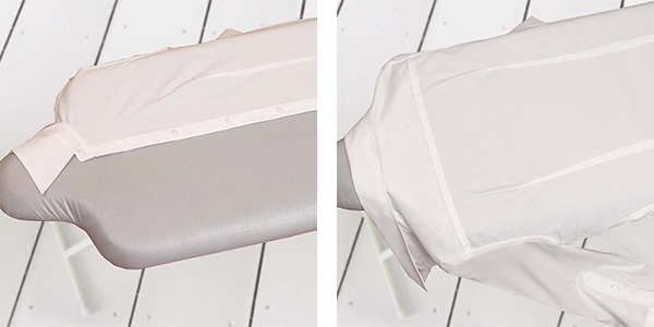 | 前身ごろ 服がピッタリフィットするから前身ごろもキレイにアイロンが掛けられます。 | 後ろ身ごろ シャツを台に着せかけて、後ろ身ごろも一気にアイロン掛けが出来ます。 |