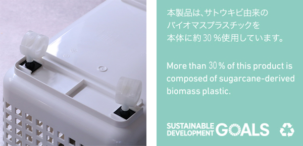 | 専用キャスターで移動が楽 別売りの専用キャスターを取り付けると、バスケットにたくさん洗濯物が入っている時や、掃除の際も簡単に移動ができます。 | 環境に優しい素材を使用 原材料には、バイオマスプラスチックを約30%使用しています。地球環境に優しく、安心してお使いいただけます。 |