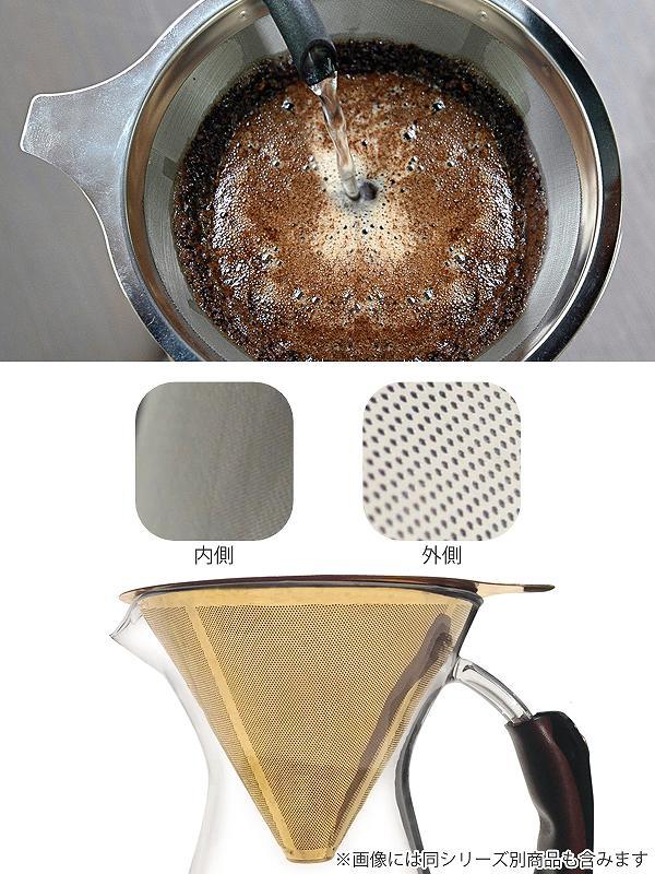 外側と内側で目の細かさが異なる二重構造のステンレスメッシュフィルターが付いています。旨味でもあるコーヒーの油分がそのままカップに注がれるので、コーヒー豆本来の味を楽しむことができます。