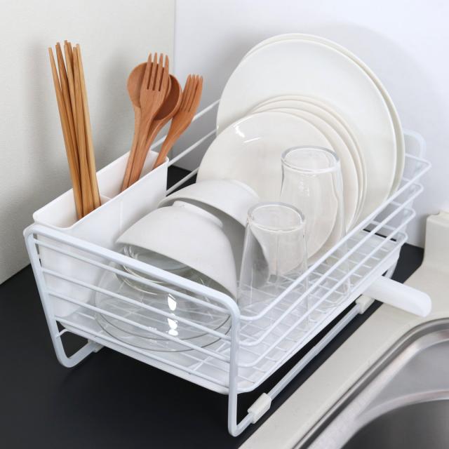 水切りカゴ スリム 水切りバスケット シンプルストレージ W ( 水切りかご 水切りラック ディッシュラック 水切りトレー 水切り 食器洗い 防サビ加工 自動排水 カトラリーポケット付き シンク横 乾燥 ホワイト 白 キッチン用品 水切りラック スリム)