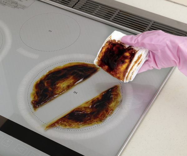 擦らずにコゲを溶かして落とし、最後に拭き取るだけの簡単お掃除が可能です。ゴシゴシ力を入れて擦る必要がないので時間もかからず疲れません。