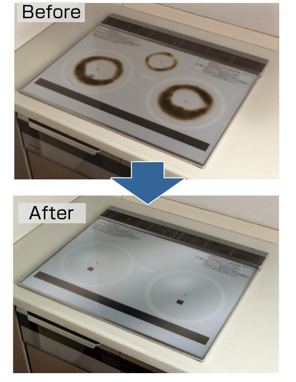 研磨剤、スクラブ剤を未使用のでガラスに傷がつく心配がありません。ツーンと鼻を突く、アンモニア臭もありません。ガラストップのガスコンロ、卓上IHコンロ、トースターオーブンレンジのガラス面にもお使い頂けます。