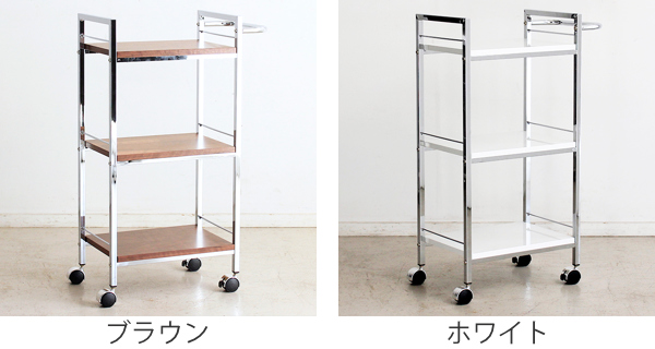 | 便利な取っ手 移動に便利な取っ手が付いています。取っ手はタオルやふきん掛けとしてもご利用いただけます。 | キャスター付き キャスターが付いており、モノを乗せての移動が簡単にできます。また、ストッパーが付いていますので固定することもできます。 |